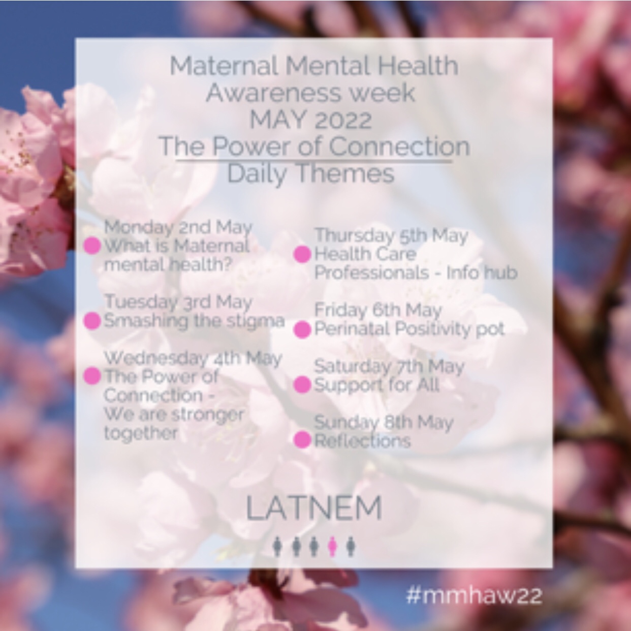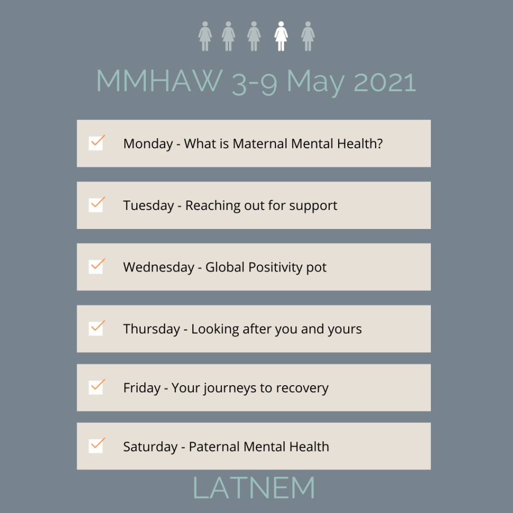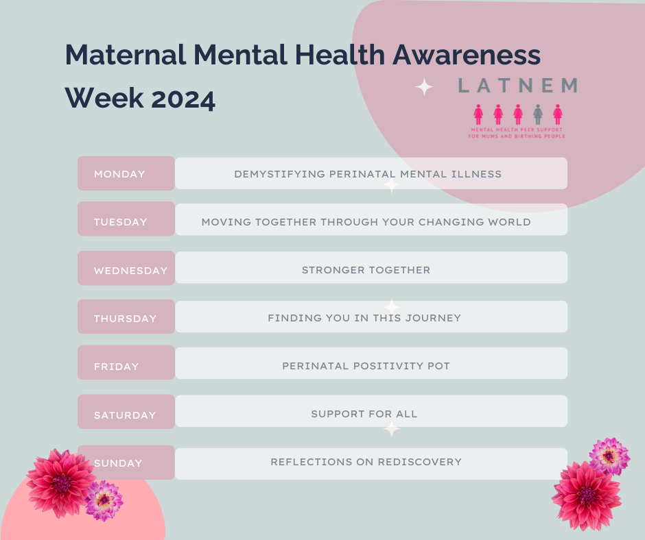 Check out the amazing Perinatal Mental Health Partnership | Facebook page and LATNEM’s social channels for lots of really good content this week.