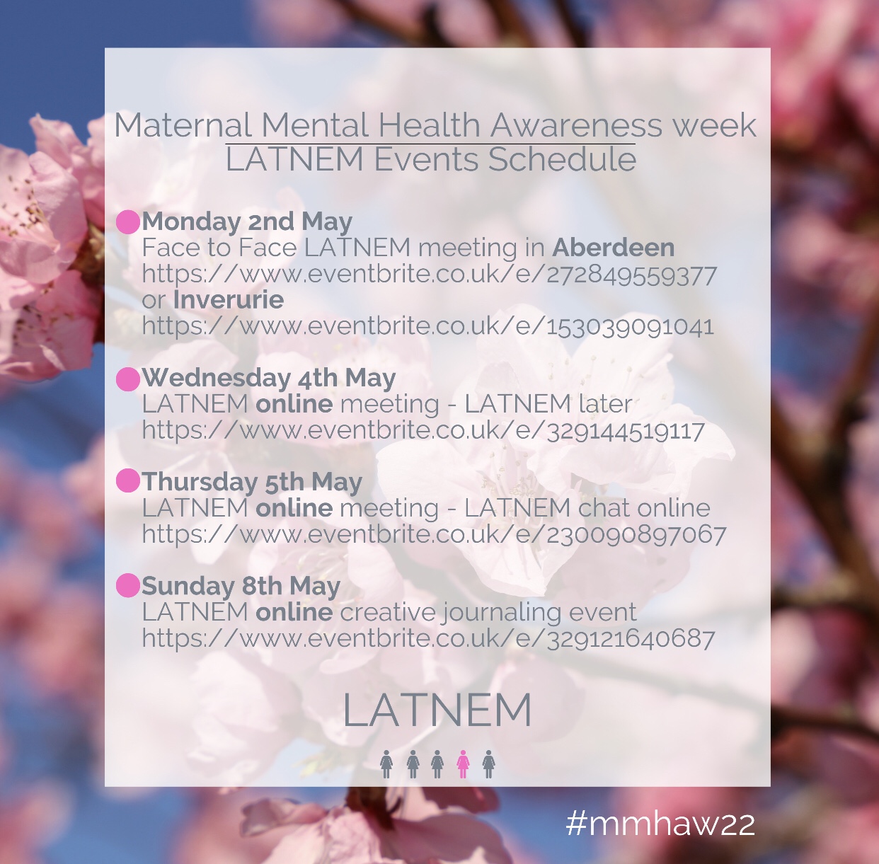 LATNEM have loads going on for MMHAW 2022, join us if you can. As usual all of these wonderful events are free of charge to book through Eventbrite and open to all mums and birthing people who need mental health support.