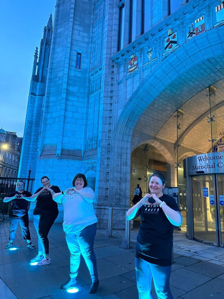 Aberdeen City Council lit up the iconic Marischal College teal for LATNEM on World Maternal Mental Health day 2024! Some of the LATNEM team went down for pictures. One of the volunteers said “this feels big, special, like someone cares about us” YES!