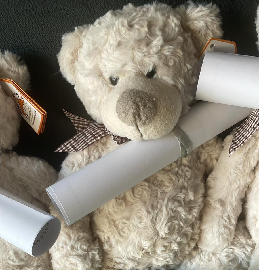 The matching teddies are something friendly and familiar that the child can see with Mummy when on a video call, and they can swap their teddies when they visit so that they can smell and hug something that has been with Mummy when they are missing her.